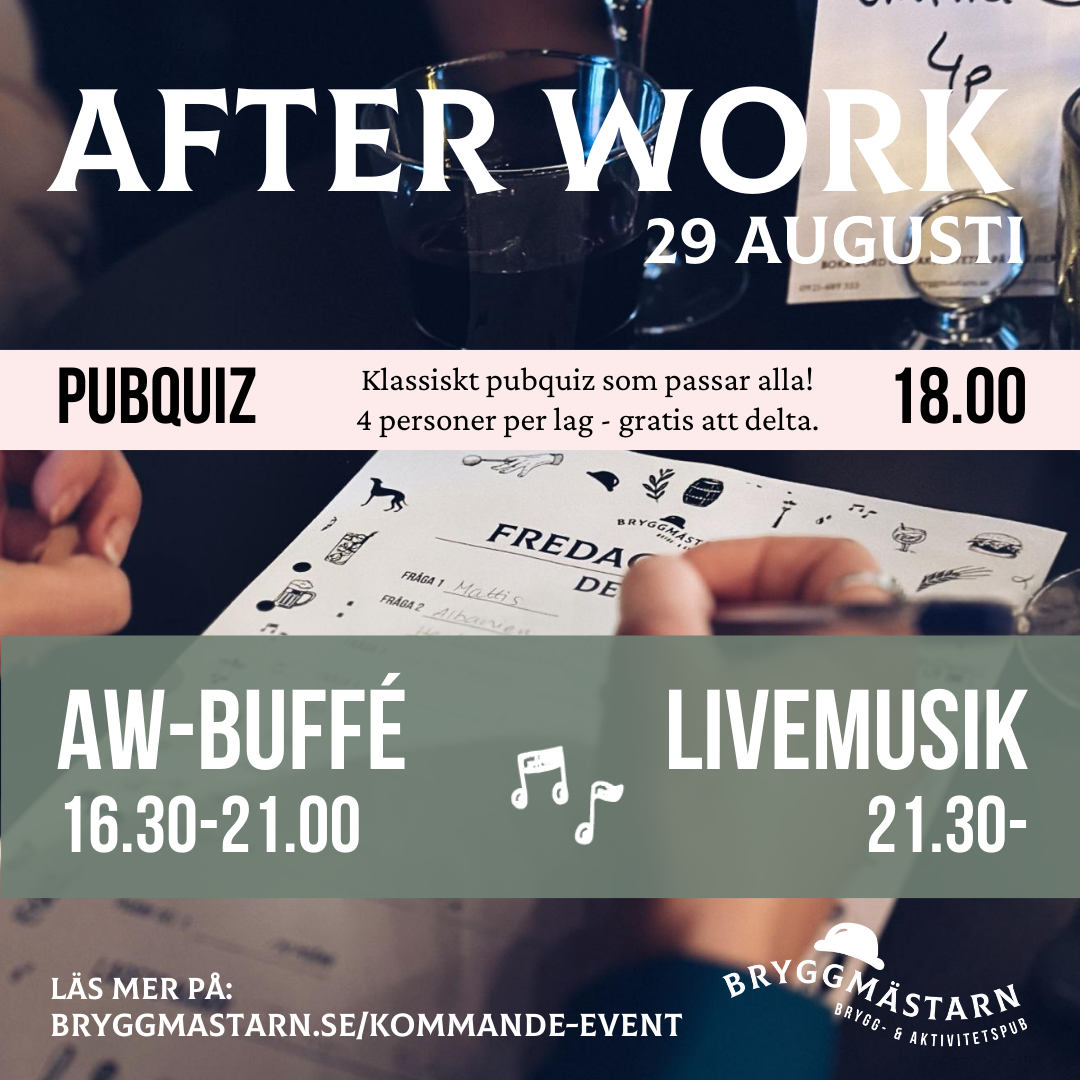 Vi serverar vår populära AW-BUFFÈ och arrangerar PUBQUIZ från klockan 18.00